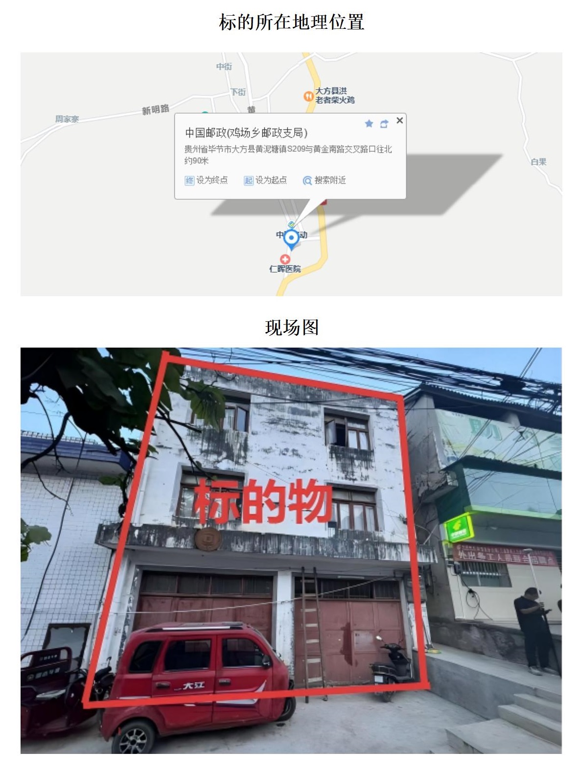 標(biāo)的位于雞場鄉(xiāng)雞場社區(qū)下街組。建筑面積:452.36㎡,土地面積:217.67㎡,建筑結(jié)構(gòu)為混合結(jié)構(gòu),總層數(shù)為2層,房屋用途為住宅,土地性質(zhì)為劃撥。